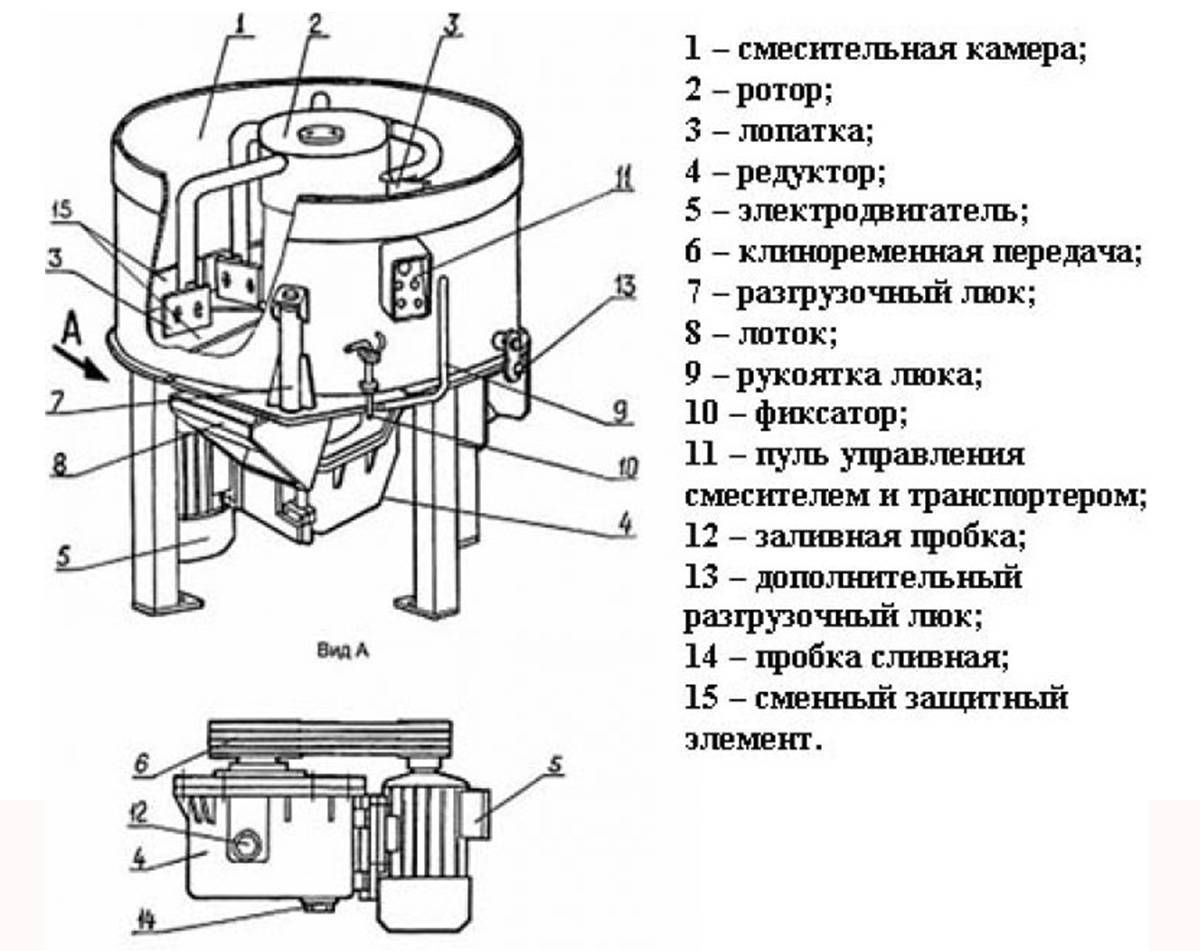 За основу берут схему заводской бетономешалки принудительного действия с вертикальным расположением смесительного вала.