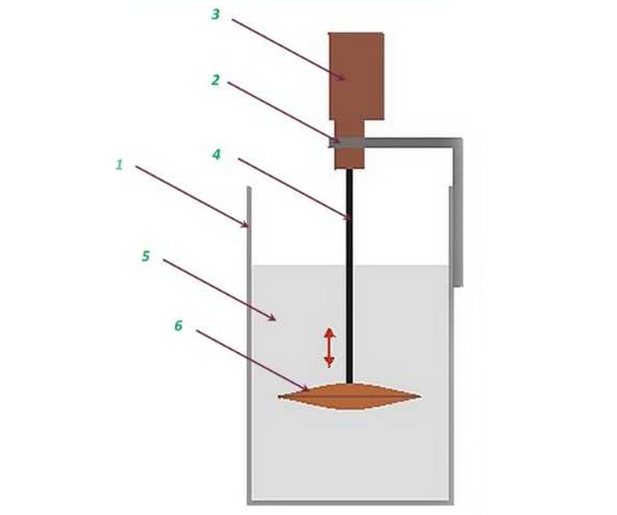 Корпус (1) для перемешивания компонентов раствора должен быть высоким, круглой формы. К одной из стенок крепят кронштейн (2). Он необходим для фиксации устройства (3), генерирующего виброимпульсы. Функции генератора выполняет перфоратор мощностью 1300-1500 Вт. Шток (4) подбирают так, чтобы вибратор во время замешивания располагался по центру приготавливаемой смеси.