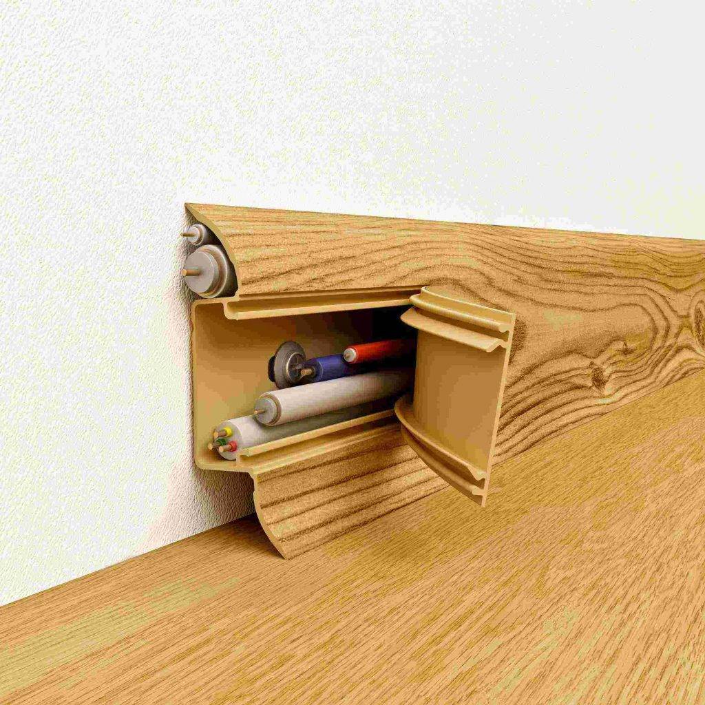 - внутренним кабель-каналом, благодаря которому может быть выполнен скрытой монтаж проводки, состоящей из одного – двух проводов различного вида. Производители предлагают изделия с различным размером кабель-канала, который напрямую зависит от размеров плинтуса. Это позволяет разместить внутри плинтуса не 1 –2 провода, а всю проводку;