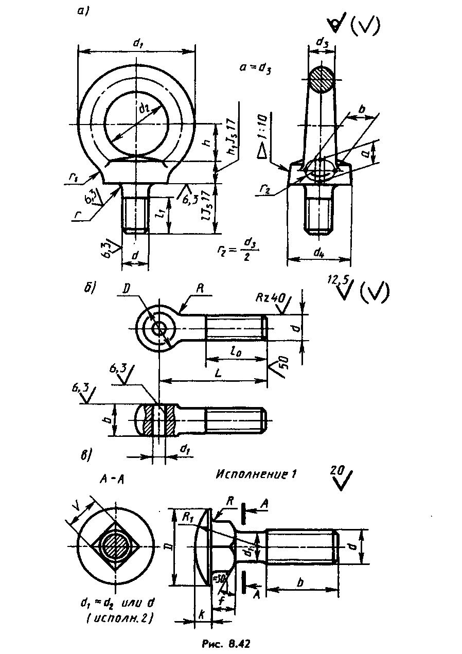 На рис. 8.42 — примеры различных болтов: а — рым-болта (ГОСТ 4751—73*), ввертываемого в тяжелые детали, например в электродвигатели для их подъема и спуска на тросах при монтаже; б — откидного болта (ГОСТ 3033—79*), позволяющего быстро зажимать или освобождать детали в различных приспособлениях; в — болта с полукруглой головкой и с квадратным подголовком (ГОСТ 7802—81*), не требующего зажима головки при завинчивании гайки. Наиболее широко применяют болты с шестигранной головкой, повышенной, нормальной и грубой точности (классов точности А, В, С), с нормальной или уменьшенной головкой, с крупным или мелким шагом резьбы, выпускаемые в одном или нескольких исполнениях. Пример такого болта, выпускаемого по ГОСТ 7798—70* (СТ СЭВ 4728—84) в четырех исполнениях, дан на рис. 8.43: 1 — без отверстия в стержне и головке; 2 — с отверстием в стержне под шплинт; 3 — с двумя отверстиями в головке для стопорения проволокой; 4 — с цилиндрическим углублением в головке, с номинальным диаметром резьбы от 6 до 48 мм, длиной от 8 до 300 мм.