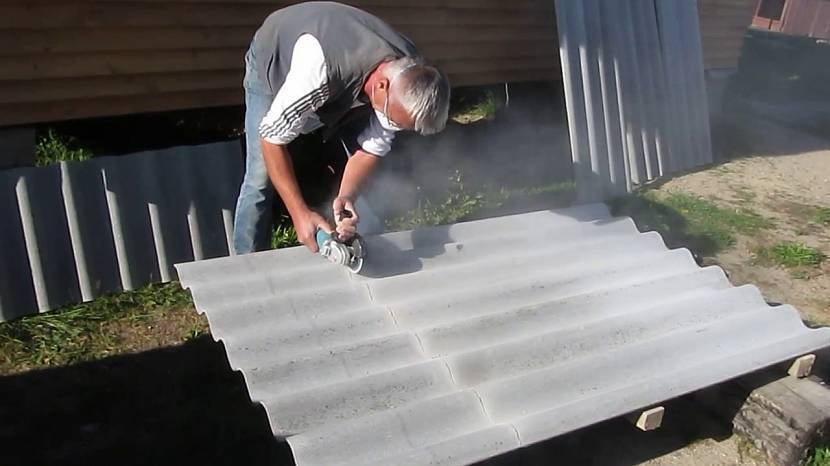 В основном Вы можете использовать болгарку с диском для камня. Но для этого вам понадобится помощник. Схема работы заключается в следующем – вы режете лист, а помощник льет тонкой струей воду на место среза. Этот метод вам поможет уменьшить запыленность окружающей среды и инструмента. Так как асбестовая пыль скапливается, засыхает и в результате становится трудно удаляемой, то все загрязнения после работы нужно обязательно смывать.