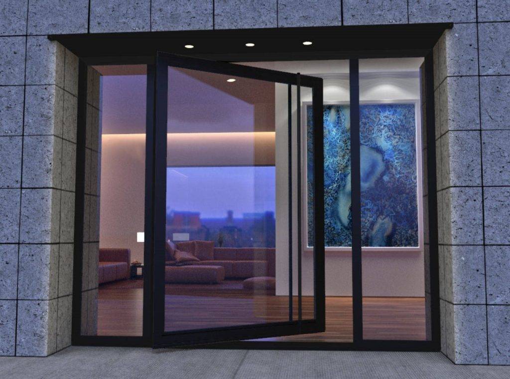 двери со стеклами по типу «маятника» – могут открываться в любом направлении, они закрепляются по двум позициям: потолок и пол;