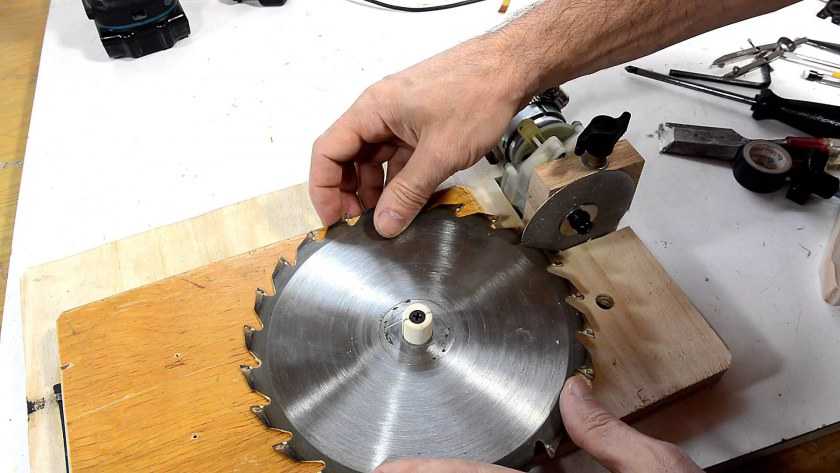 - Если материал будет резаться под разными углами, отверстие под диск нужно сделать в форме перевернутой трапеции.