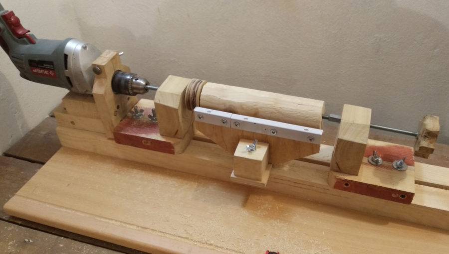 Собранная конструкция станка предусматривает, что все рабочие узлы находятся строго на одной оси. Должно быть обеспечено максимально точное центрирование по оси вращения заготовки от патрона дрели до регулировочного болта задней бабки.