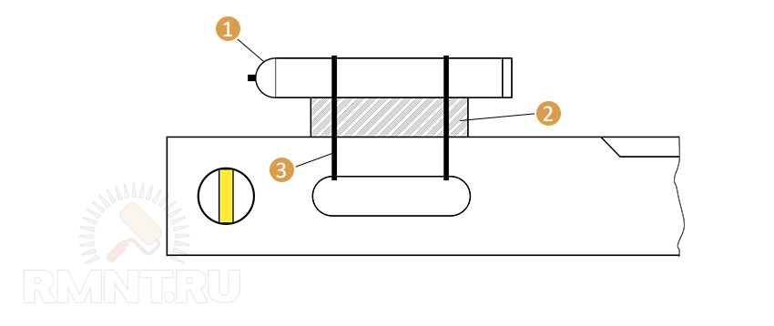 Здесь 1 – это указка, 2 – кусок плотного и в меру упругого материала, 3 – хомуты или резинки. После установки пузырькового уровня строго по горизонтали (это можно сделать на любой ровной поверхности) включается лазерная указка. Подрезая вставку и плотнее или слабее затягивая хомуты, мы проводим своего рода юстировку нивелира (будущего). После того, как параллельность горизонтальной плоскости и луча лазера достигнута, можно крепить получившееся устройство на треноге любым удобным способом.