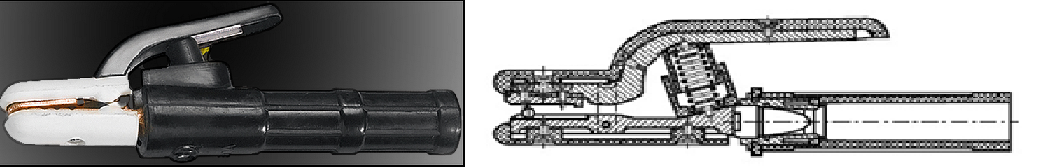 Конструкция клещевого зажима можно понять, посмотрев на рисунок. Подобные изделия производятся различными фирмами-производителями. Подразделяются по мощности, выдерживая ток от 150А до 500А. профессиональные выдерживают от 500 до 700 А. Основное отличие может быть в конструкции зажима верхней губки и обеспечивать надежное крепление электрода под различными углами. Для того чтобы приспособление прослужило долго необходимо обязательно посмотреть материал, из которого изготовлены губки, токовая шина от крепления кабеля наконечника и гильза.