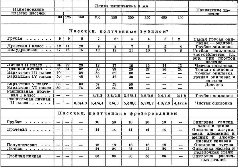 Количество насечек на единицу длины в зависимости от длины напильника и назначение напильника в зависимости от насечки показаны в таблице.