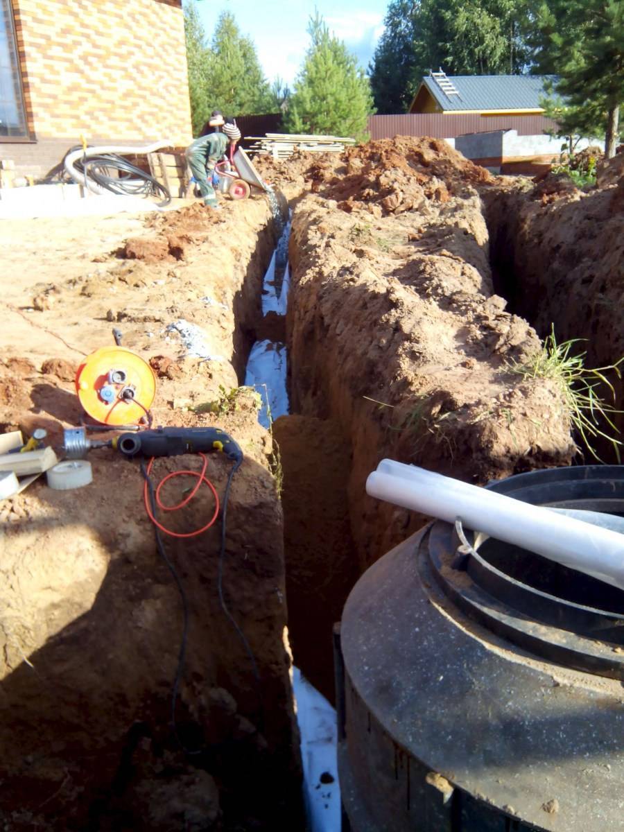 - Дно траншеи необходимо выровнять с помощью слоя песка толщиной от 5 до 10 см. В то же время не следует забывать о том, что дно канавы должно иметь уклон в 2 см на 1 погонный метр.