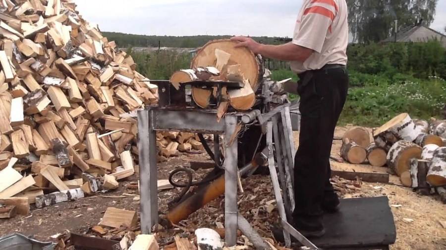Это не самое простое и дешевое, но достаточно мощное и очень производительное устройство, почти исключающее ручной труд при колке дров. Потребуется только устанавливать поленья на платформу и собирать готовые дрова в поленницу.