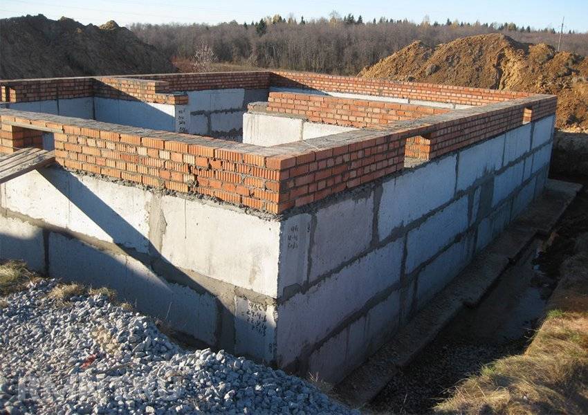 Сборный фундамент из блоков ФБС может устанавливаться с сочетанием кирпича или камня. Такая практика применяется при монтаже блоков больших размеров, что способствует более точному выставлению ФБС-элементов по уровню и препятствует образованию различных трещин и разрывов.