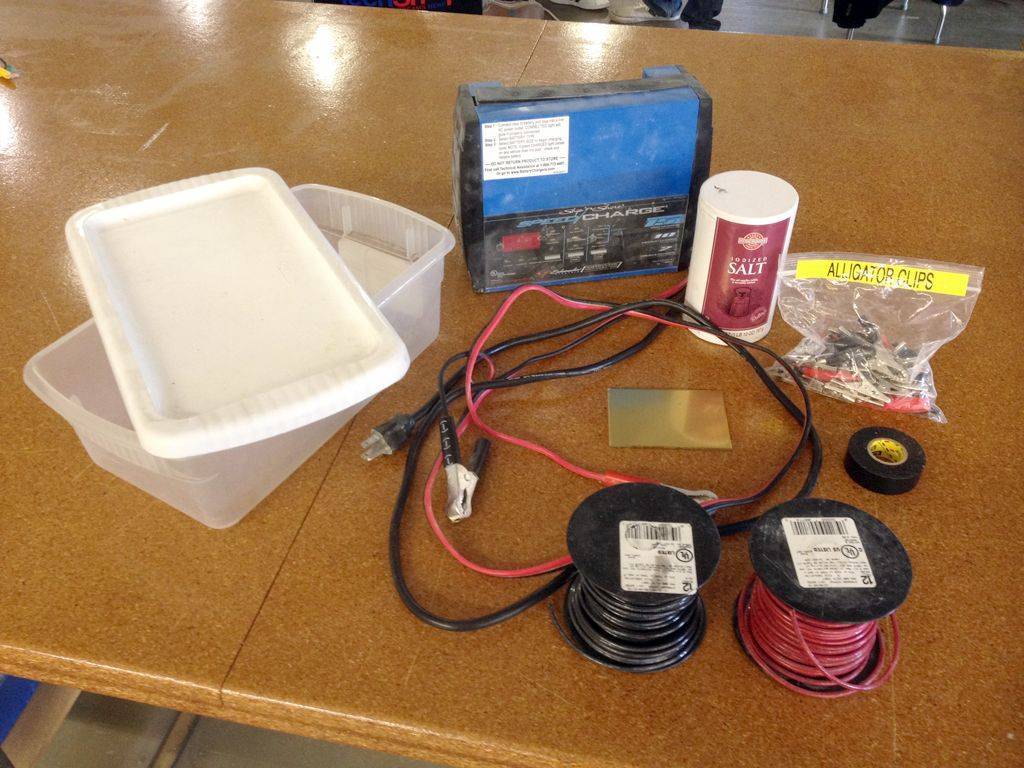 - Стеклянная емкость (по размеру обрабатываемой заготовки). Естественно, не бутыль с узким горлышком, а банка, стакан или ванночка. Источник постоянного напряжения (до 15 В). Он должен давать ток 0,5 А, как минимум. Оптимальный вариант – зарядное устройство для АКБ личного авто. Автор именно его и использовал. Хотя некоторые умельцы для этих целей берут зарядники аккумуляторов бытового инструмента (шуруповерта и так далее), и даже сотовых тлф. Парочка проводов для присоединения и зажимов (например, типа «крокодил»). Любая металлическая заготовка (та же ложка), которая будет играть роль второго электрода. Солевой раствор. Концентрация определяется на «глазок», поэтому общая рекомендация такая: на стакан воды – 2 ложки (чайных). Лак. Он понадобится для окрашивания сегмента металла, на котором планируется нанесение гравировки. В большинстве статей, посвященных эл/химическому способу, есть советы по применению состава для ногтей. Автор, чтобы «не травмировать» жену такой расточительностью, использовал так называемый цапон-лак, который хорошо известен радиолюбителям и эл/монтажникам. Стоит копейки, не дефицит, и легко снимается растворителем.