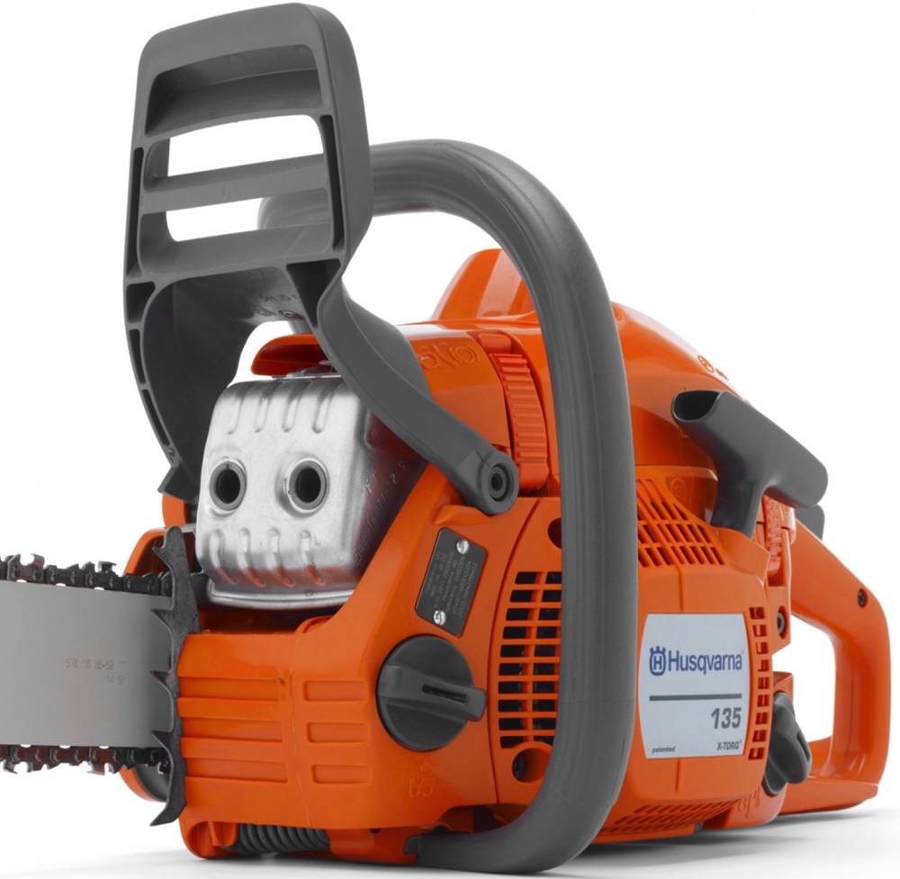 Для экстренной остановки шины и пильной цепи в устройстве Хускварна 135 предусмотрен мгновенный инерционный тормоз. Он включается и выключается при помощи отдельной ручки. Для безопасности оператора в комплектацию инструмента также включен щиток, защищающий правую руку вальщика.