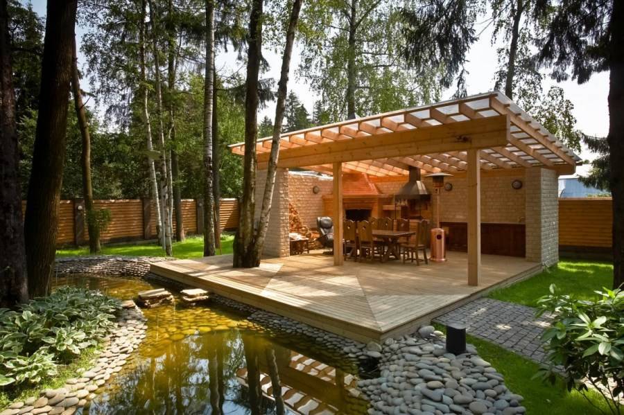 Дачные беседки бывают открытого и закрытого типа, «живые» и с барбекю.