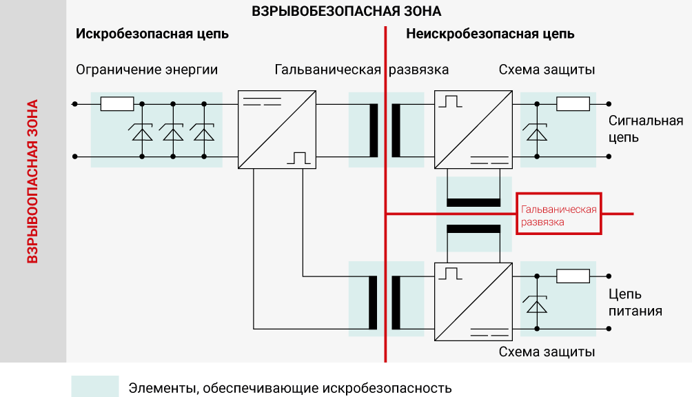 Принципиальное отличие активных барьеров от пассивных заключается в том, что активный барьер имеет в своем составе активные полупроводниковые элементы, которые обеспечивают питание датчика с ограниченными параметрами по току и напряжению, позволяют выдавать/принимать сигналы и преобразовывать их в унифицированные (4…20 мА) и т.д. Современные активные барьеры имеют гальваническую развязку между цепью датчика и цепью связанного оборудования, находящегося во взрывобезопасной зоне. Гальваническая развязка означает, что датчик, находящийся во взрывоопасной зоне, и контроллер, находящийся в безопасной зоне, не имеют непосредственного электрического контакта. Цепи с гальванической развязкой являются самыми безопасными и помехозащищенными. Активные барьеры включают в себя пассивный барьер со средствами развязки (транзисторные оптопары или трансформаторы), преобразователи сигнала и т.д. (рис. 4).