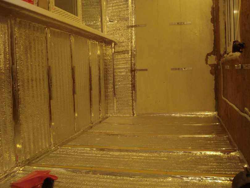 Листы сажаются между обрешёткой на клей, стыки закрываются металлическим скотчем. Полная изоляция получается благодаря пенофолу, который покрывает утеплитель для лоджии. Монтажная пена, используемая при монтаже пеноплекса, не должна содержать толуол, иначе это вещество «разъест» весь утеплитель