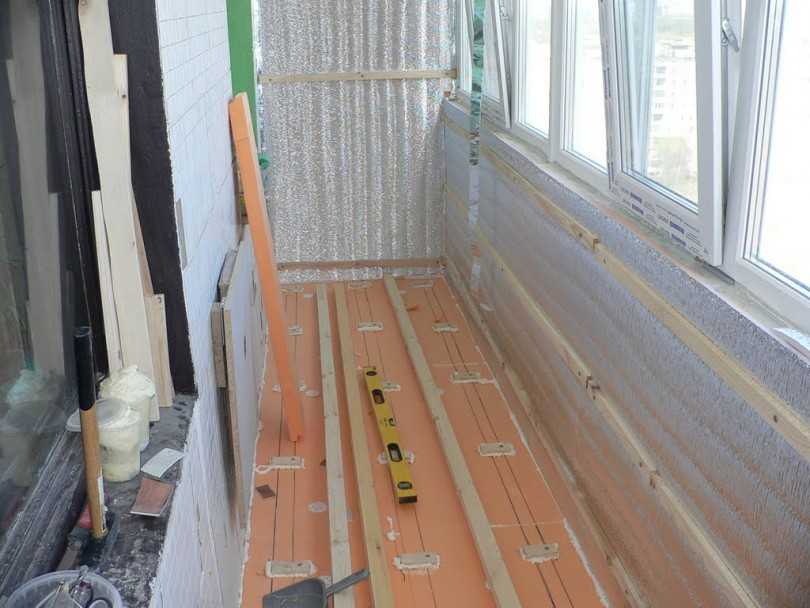 - Прикрепить поперек длины лоджии, к ее полу деревянные брусья, после чего выровнять их по горизонтальному уровню.