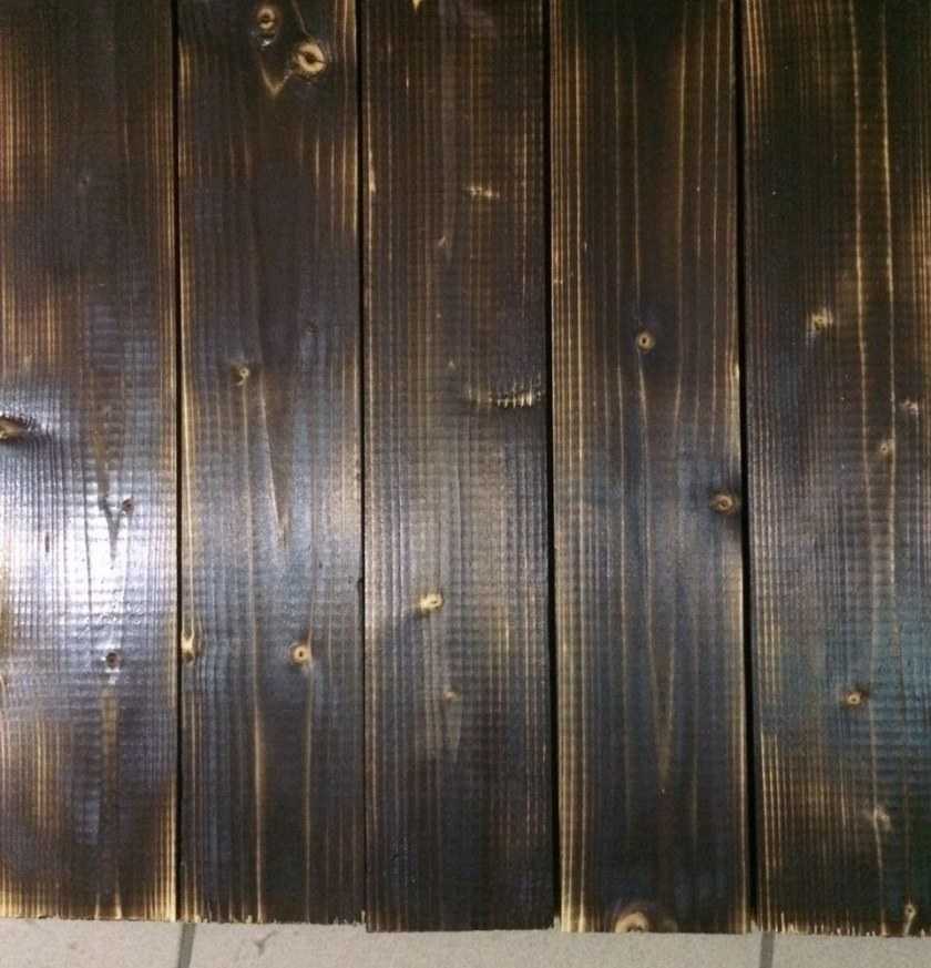 Обработка древесины комбинированным способом (обжиг + браширование) позволяет получить необычные декоративные эффекты. Для этого по заготовке сначала проходятся газовой горелкой или паяльной лампой.