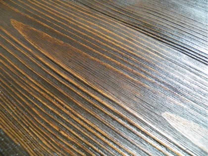 После обжига выполняется браширование щеткой. Годовые кольца при этом останутся темными от обжига, а на месте удаленных мягких волокон появятся светлыепрожилки.