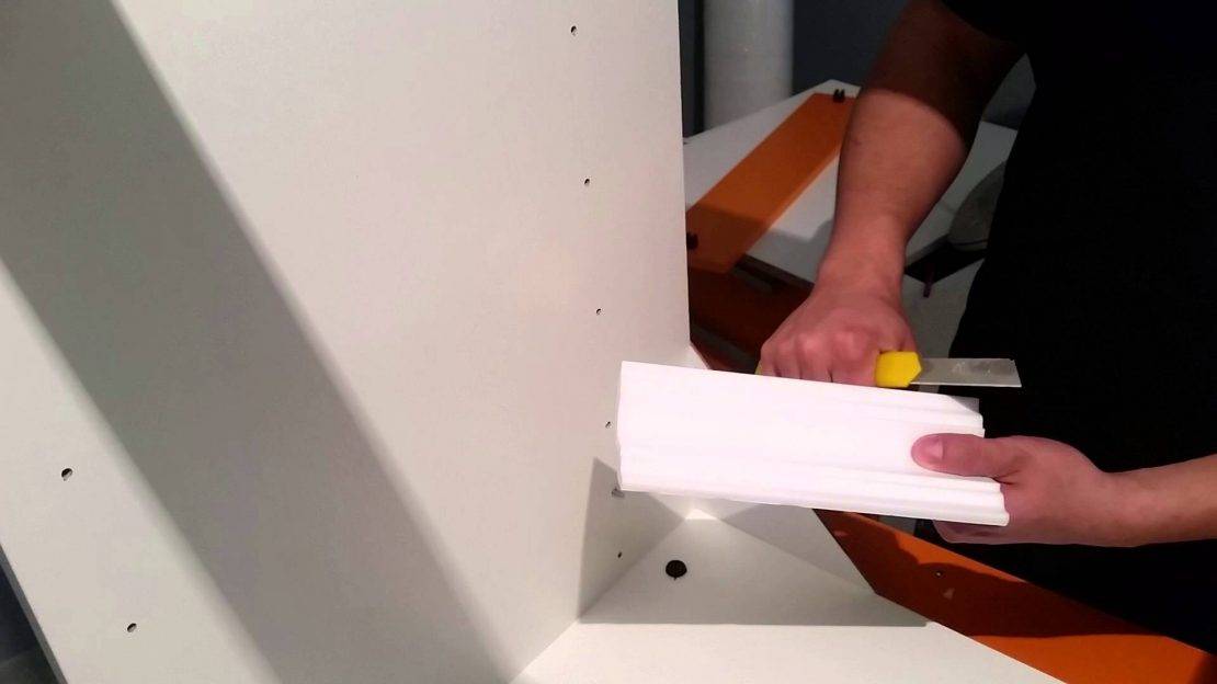 - Срежьте деталь острым лезвием по отмеченной полоске. При стыковке компоненты надо идеально совместить. По аналогичной технике возможно отрезать материал и для формирования наружных уголков плинтусов.
