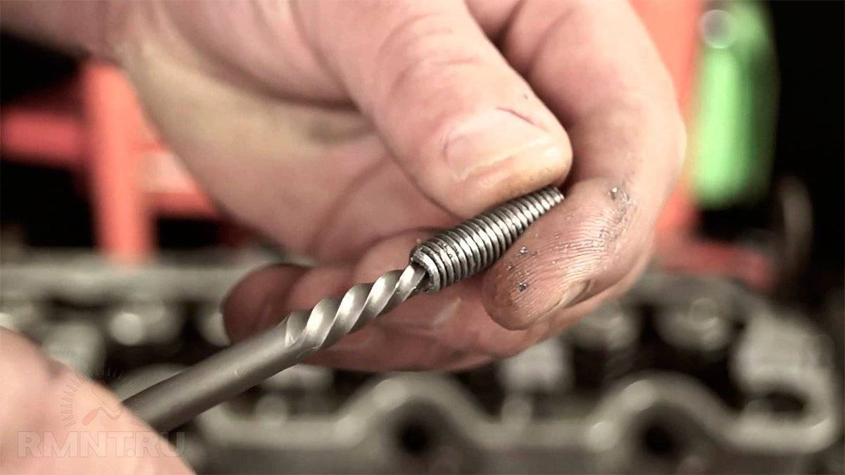 Дальнейшие действия, описывающие как высверлить сломанный болт, описаны в пункте о поверхностном обрыве. После проделывания отверстия остатки резьбы просто удаляют крючком.