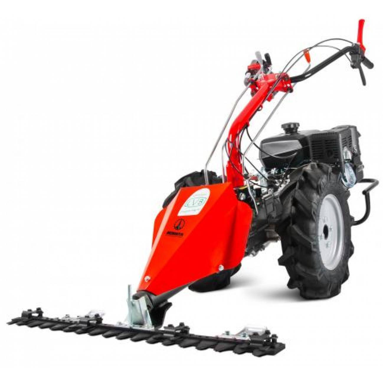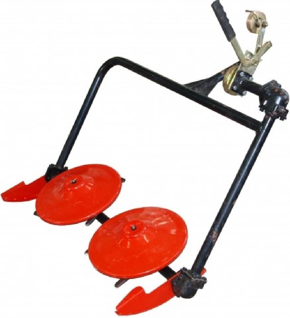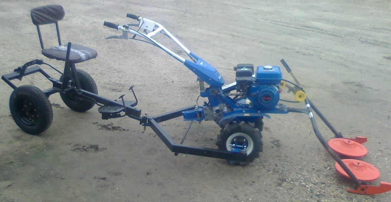 Само приспособление для кошения травы расположено с правой стороны и крепится к раме шарниром для поднятия и опускания полотна. Имеется сиденье для оператора и рычаги управления, с помощью которых производят наклон режущего органа. Благодаря этому можно легко обрабатывать обширные территории и садовые участки и лесополосы. Стоимость такого агрегата начинается от 50 тыс. рублей.