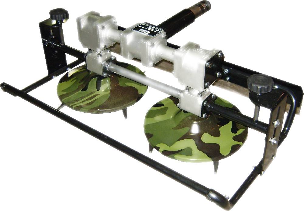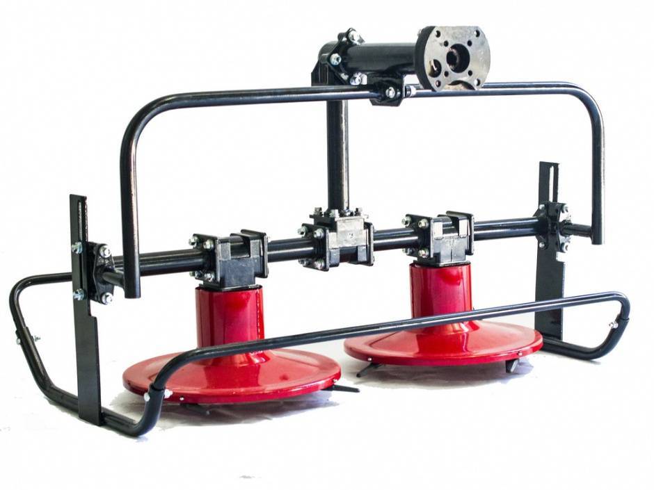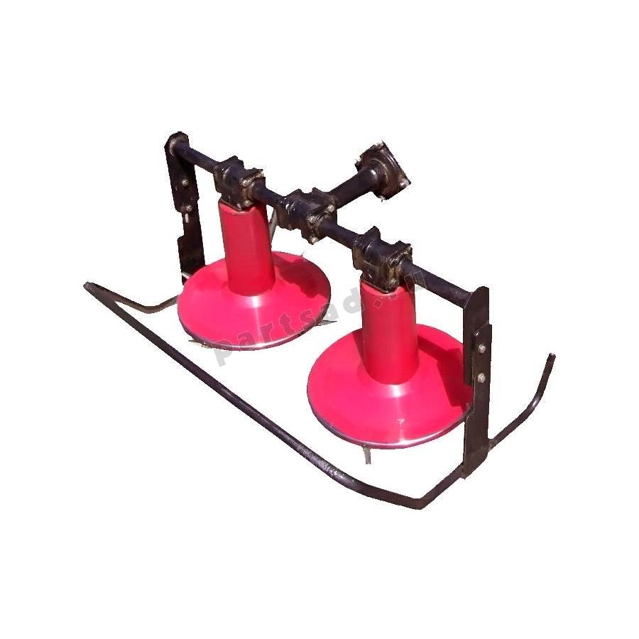 Эти два диска установлены на сварной раме и связаны с приводом ВОМ. Вращение дисков должно происходить навстречу друг другу, что позволит косить траву рядами.