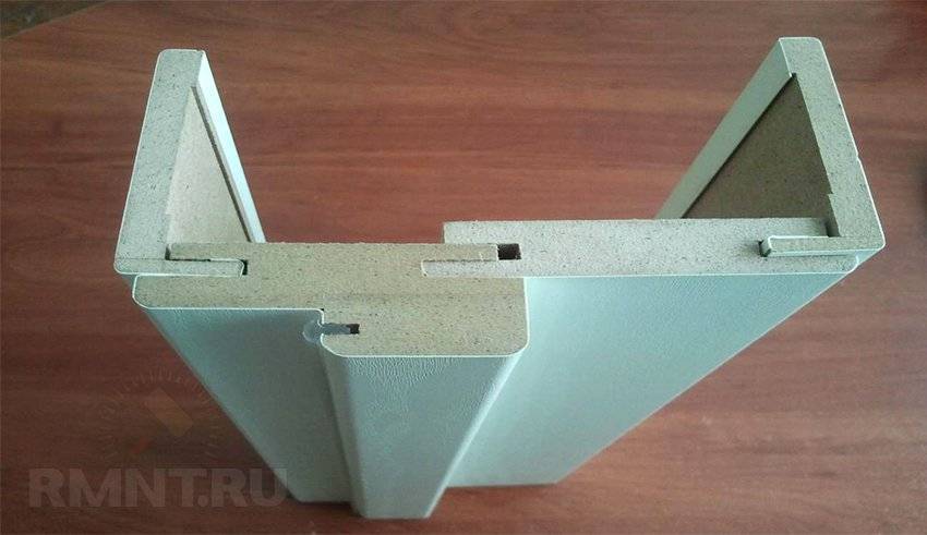 Сборка дверной коробки выполняется на незакаленных саморезах, верхний сегмент всегда располагается поверх боковых стоек, а не между ними. После сборки коробки необходимо срезать с краев перекладины излишки бортика, чтобы установочный паз был непрерывным по всем трем сторонам.