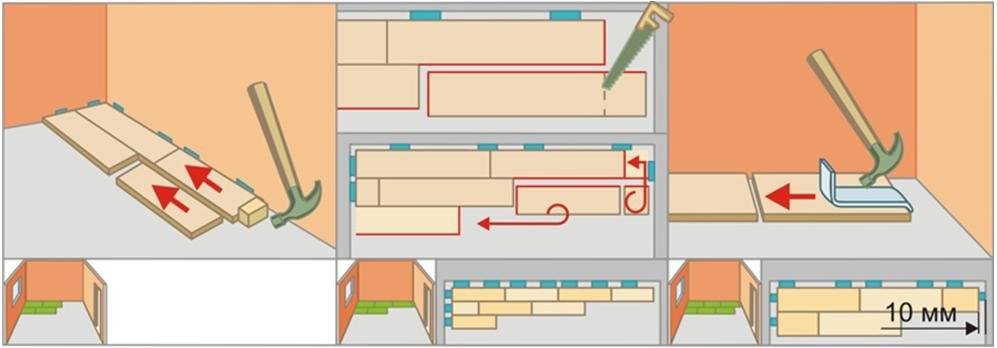 Доски сначала крепят в ряд по меньшей стороне, потом монтируют. Это ускоряет процесс укладки, а вероятность повреждения замков – снижается.