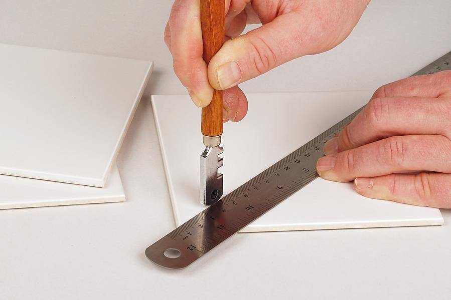 При работе с кафельной плиткой инструмент любого вида продавливает на поверхности неглубокую бороздку, по которой элемент разламывают.