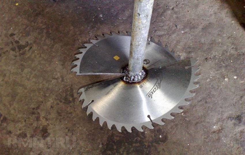 Более усовершенствованную модель можно изготовить из старого диска циркулярной пилы. Для этого его необходимо распилить пополам и половинки приварить к штанге под углом 30–40° относительно друг друга