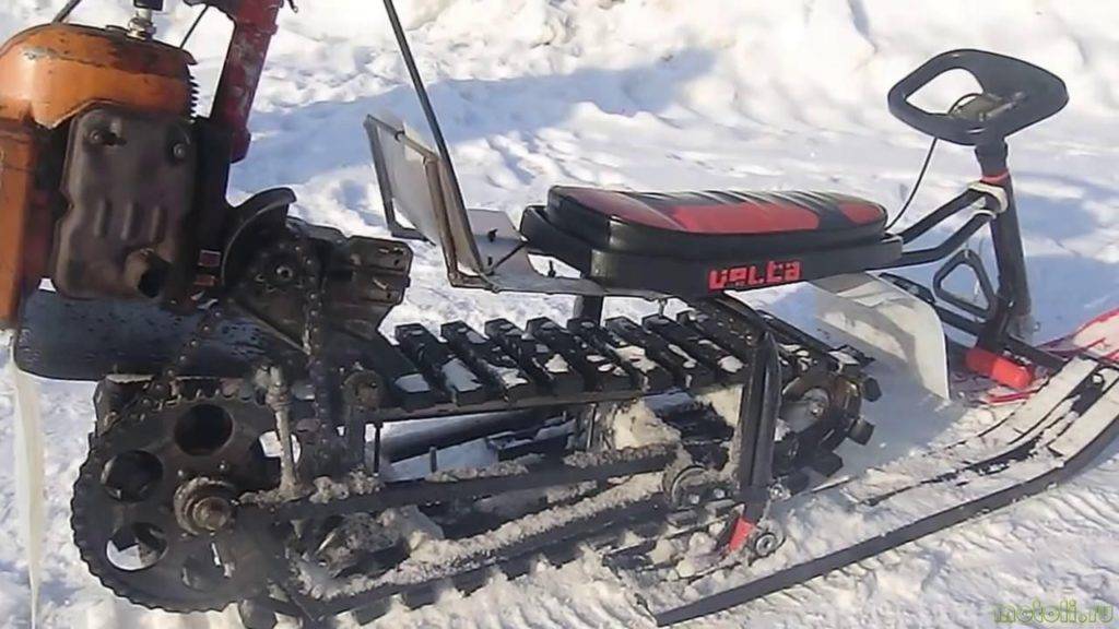 Система управления основана на движении опорных рычагов посредством двуручного руля. Можно воспользоваться рулем от старого велосипеда. Цепная передача — из двух ступеней. Первая – с большой ведомой звездочкой, вторая ступень – с ведущей звездочкой. Дополнительно в целях безопасности оснащают снегоход из бензопилы фарами, различными ограничителями.