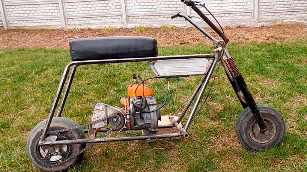 Уважаемые посетители сайта «В гостях у Самоделкина» из представленного автором материала вы узнаете, как можно самостоятельно сделать мини-байк трехколесник с двигателем от бензопилы «Урал» имея при этом минимум средств, итак поехали)