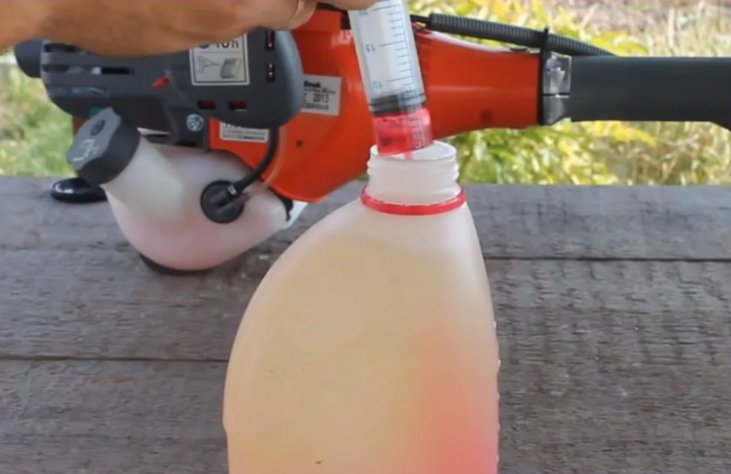 Оптимальное соотношение масла и бензина можно посмотреть в инструкции к триммеру. Как правило, оно равно 1:50, 1:40 или 1:25 (для сильно изношенных двигателей). Соблюсти пропорции поможет мерная емкость с миллилитровой шкалой или шприц большого объема.
