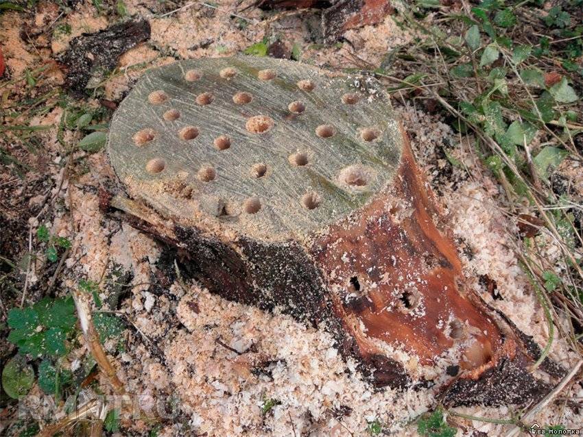 Оставшийся пень корчевать вручную слишком утомительно. Используя бур по дереву на 16–20 мм, насверлите в срезе ствола вертикальных отверстий такой глубины, чтобы они уходили ниже уровня земли на 15–20 см. Сверлить нужно в шахматном порядке с интервалом 5–7 см. Используя воронку и шомпол, засыпьте в отверстия аммиачную селитру доверху, сверху прикройте куском рубероида. К следующему сезону пень превратится в труху, и вы легко удалите его остатки.