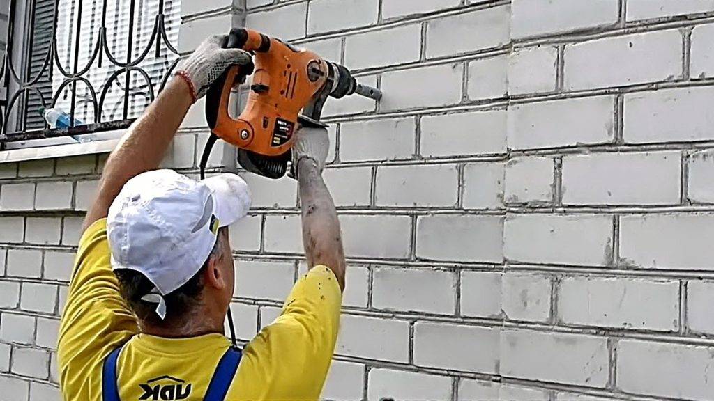 При отсутствии электрического инструмента сверление отверстий можно сделать с помощью шлябура. Для этого предварительно намечаются места бурением пробойником. После этого по шлямбуру, который прикладывается к стене под углом 90 градусов, ударяется молотком. Каждые три удара шлямбур проворачивается, а из трубы удаляются остатки кирпича. Таким образом, отверстие выбивается до достижения им необходимой глубины.