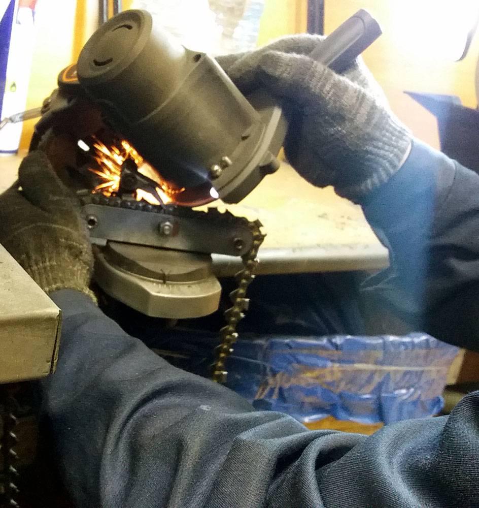 ![]() | Заточка цепей бензопил делается на специальном станке с соблюдением точного угла заточки |