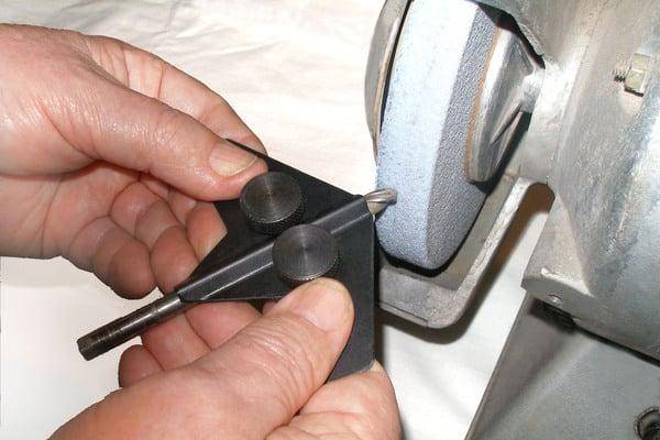 Заточка на точильном круге считается более удобным и безопасным способом по сравнению с болгаркой. Если опыт не позволяет определить уровень износа сверла по металлу и выполнить его оправку на точиле «на глаз», нужно воспользоваться специальным приспособлением – держателем, устанавливаемым вблизи рабочего диска. Во избежание смещения фиксатор надежно прикрепляется посредством болтового соединения.
