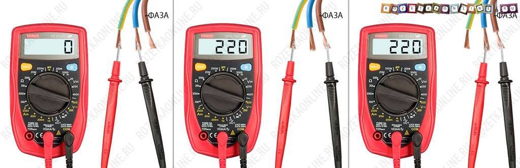 Если бы провода было три – фаза, ноль и заземление, то достаточно было бы измерить напряжение на каждой из пар, точно так же, как мы определяли его в розетке. При этом между двумя проводами напряжения практически бы не было – между нолем и заземлением, соответственно оставшийся третий провод фазный. Ниже представлена наглядная схема определения.
