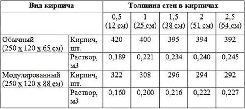 В таблице, расположенной ниже, представлены стандартные нормативы расхода материала в зависимости от толщины кирпичной кладки: