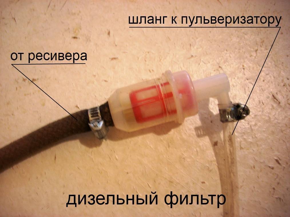 Теперь третий отрезок шланга (10 см) одним концом надеваем на выходную трубочку ресивера, а второй конец одеваем на дизельный фильтр. Надеваем хомуты. На фильтрах (дизельном и бензиновом) нарисована стрелочка, указывающая правильное направления движения через фильтр воздуха. Подсоединяйте оба фильтра правильно. Дизельный фильтр на выходе нужен для фильтрования воды из воздуха.