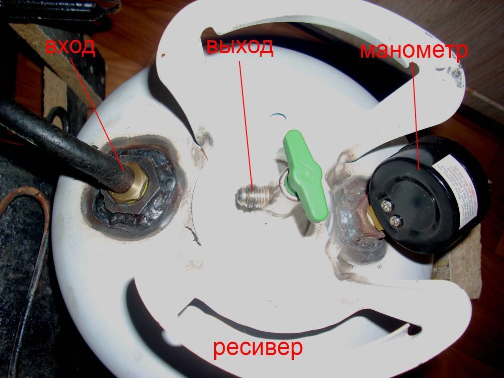 Если у вас железный ресивер, делаем то же, но не клеим трубочки, а паяем или привариваем. Также можно приварить гайки, а в них потом закрутить штуцера под шланги.