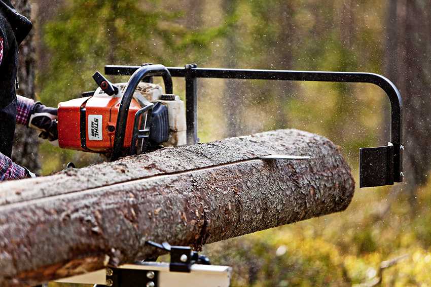 При использовании насадки для продольного распила необходимо тщательно закрепить её на корпусе бензопилы. Перед началом работы необходимо позаботиться о создании базовой поверхности, параллельно которой будет происходить распил бензопилой.