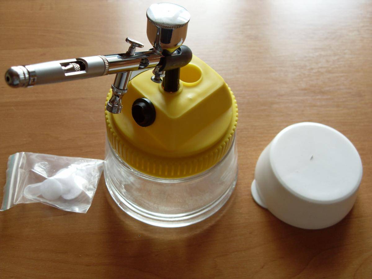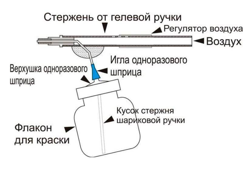 Похожая, но несколько своеобразная конструкция с миниатюрным бачком и иглой шприца для подачи краски. Удобный вариант для обработки небольших деталей.