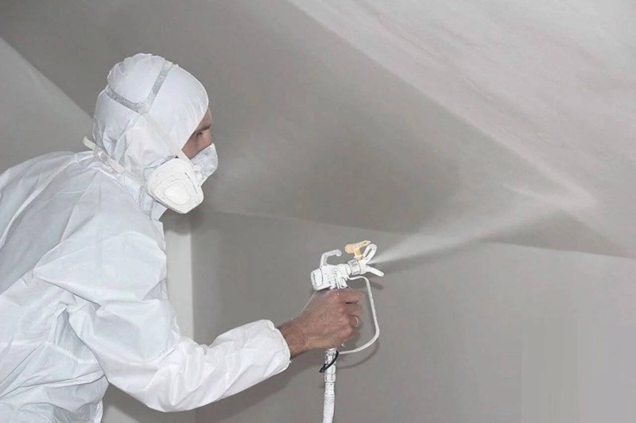 - Чтобы окрашивать краскораспылителем потолок, держать сопло следует в 30−50 см от поверхности. Струя должна быть направлена перпендикулярно потолку.