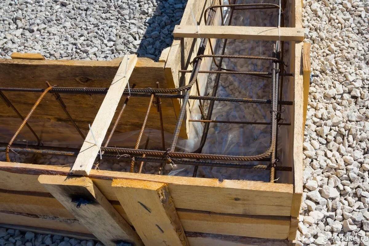 К рабочим пруткам вертикально крепят хомуты из гладкой или рифленой стали диаметром 8-10 мм. Шаг хомутов по строительным нормам должен быть не менее 3/8 от высоты фундамента (20-50 см).