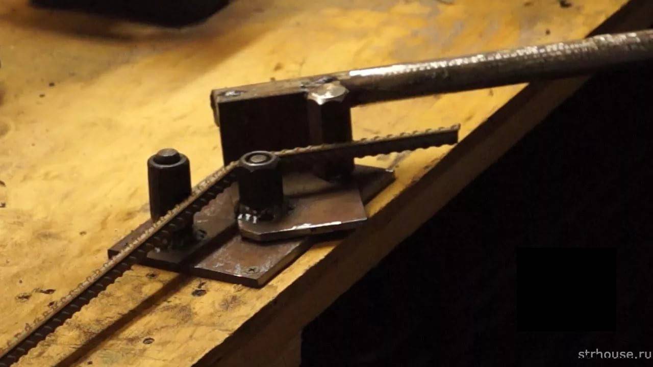 Здесь возникает вопрос, как правильно гнуть арматуру для фундамента. Для этого используют специальное приспособление — арматурогиб, состоящее из трех стержней разного диаметра, жестко закрепленных на устойчивое, преимущественно стальное основание. Такое приспособление можно изготовить самостоятельно, либо приобрести в магазине.
