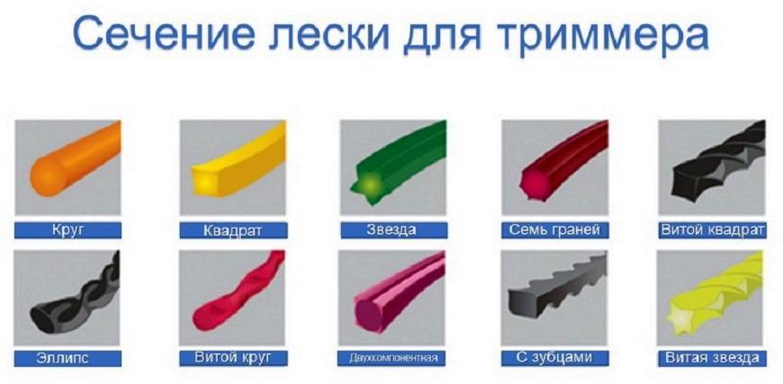 Производители используют для увеличения работоспособности прибора лески различной формы сечения. Это могут быть жилы в виде креста, звезды, многоугольника. Как один из вариантов применяется фигурная леска с насечками или в виде спирали. Такие лески создают меньше шума и очень качественно убирают траву, но они менее прочные, быстрее рвутся и поэтому больше расходуются.
