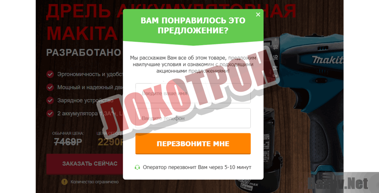 Для того, чтобы получить дрель, мошенники просят оставить заявку на сайте, подождать звонка менеджера, который уточнит детали, а после ждать посылку. Оплата якобы при получении. Но это ложь. Жулики всегда требуют деньги вперёд.