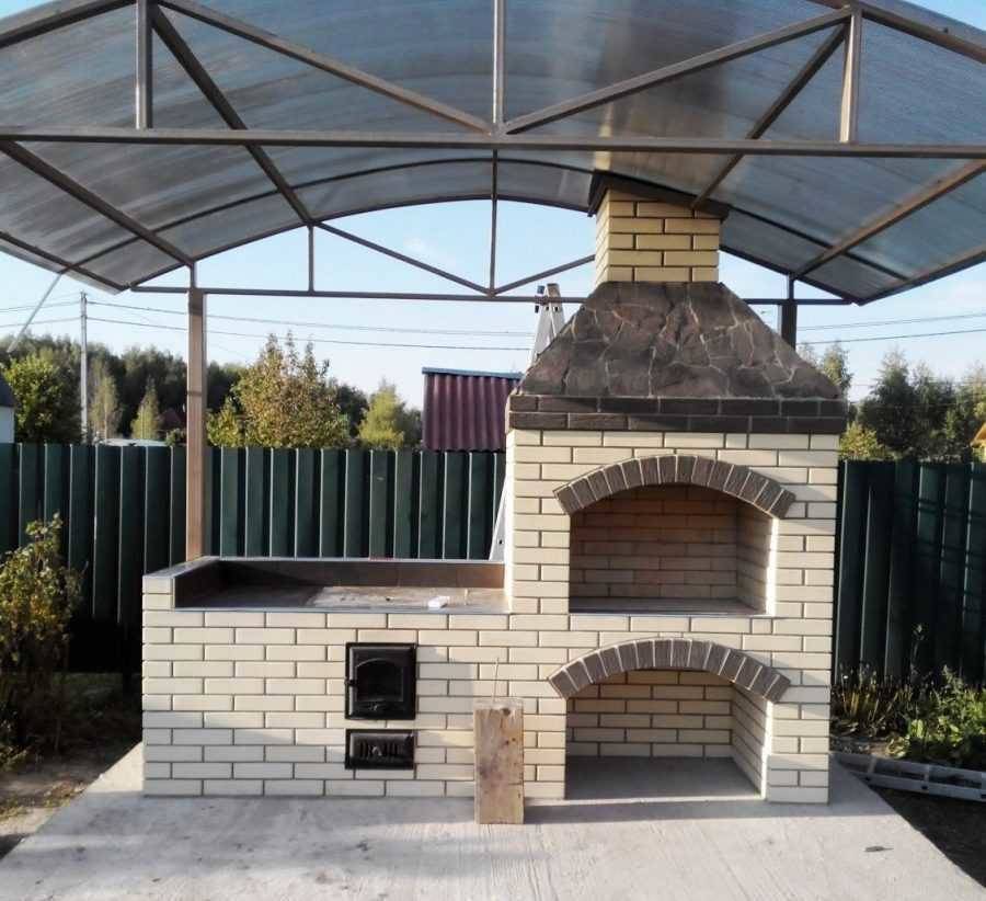 - Вмурованные. Жаровня вставляется основание из шамотного кирпича или брусчатки. Оборудуется разделочным столом и полками для хранения дров и инвентаря.