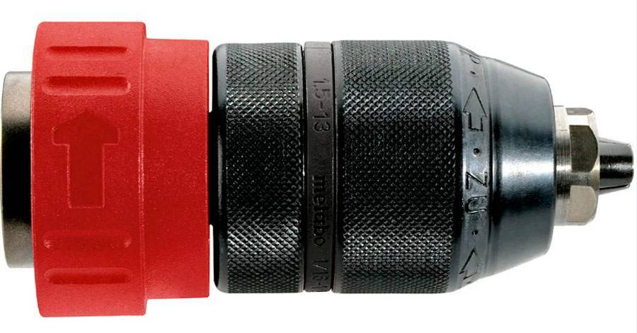 - Патрон быстрозажимной (БЗП) – зажатие насадки происходит с помощью усилия одних лишь рук. Существует два подтипа таких устройств – двухмуфтовые и одномуфтовые. В первом случае одной рукой задняя муфта удерживается, а второй откручивается передняя муфта. В одномуфтовом патроне все еще проще – достаточно усилия одной руки. Однако он применим лишь к дрелям с автоматической блокировкой вала.